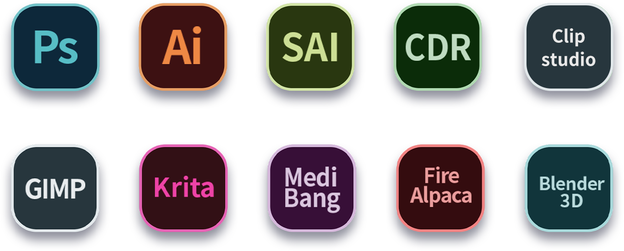 Photoshop, SAI, Painter, Illustrator, Clip Studio등과 같은 주요 소프트웨어에서도 호환 가능합니다.