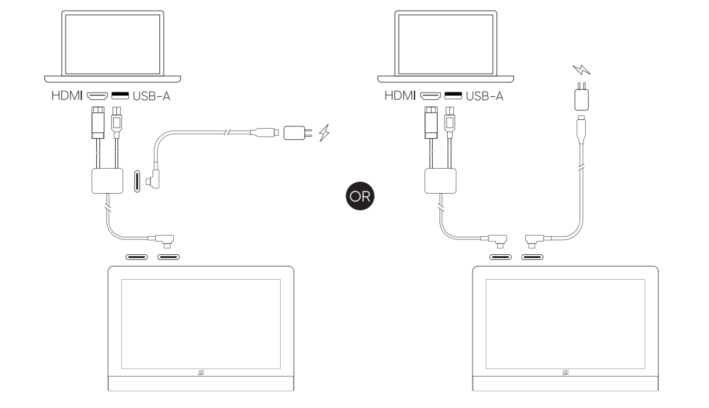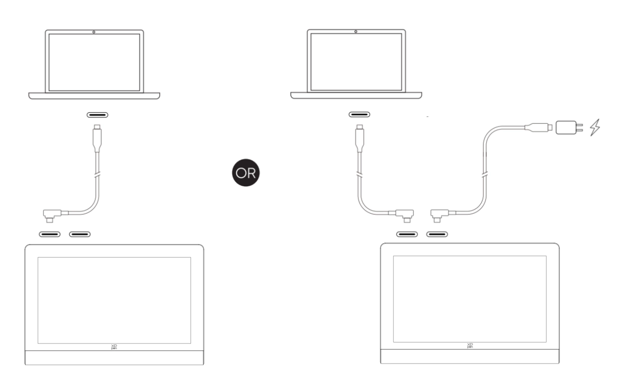 컴퓨터의 출력 전력 제한으로 인해 USB-C to USB-C 단일 연결 시 제품이 최대 밝기를 지원하지 않거나 화면 깜빡임 또는 블랙스크린이 발생할 수 있습니다. 이 경우, 두 번째 USB-C 케이블로 액정 타블렛과 전원 어댑터를 연결하여 전원을 공급하십시오.