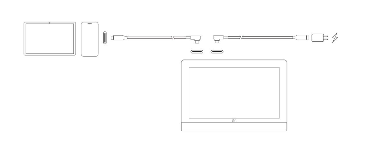 1. USB-C to USB-C 케이블로 스마트폰/태블릿과 액정 타블렛을 연결합니다.