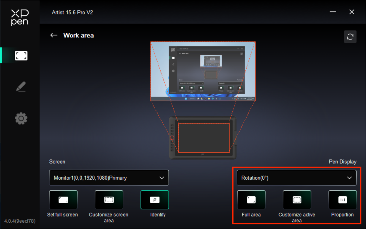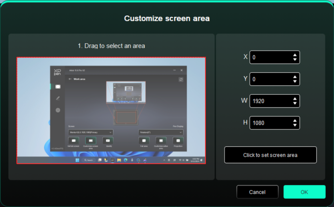클릭하여 활성 영역을 설정하기: 스타일러스를 사용하여 기기의 왼쪽 상단 모서리 위치와 오른쪽 하단 모서리 위치를 클릭합니다.
