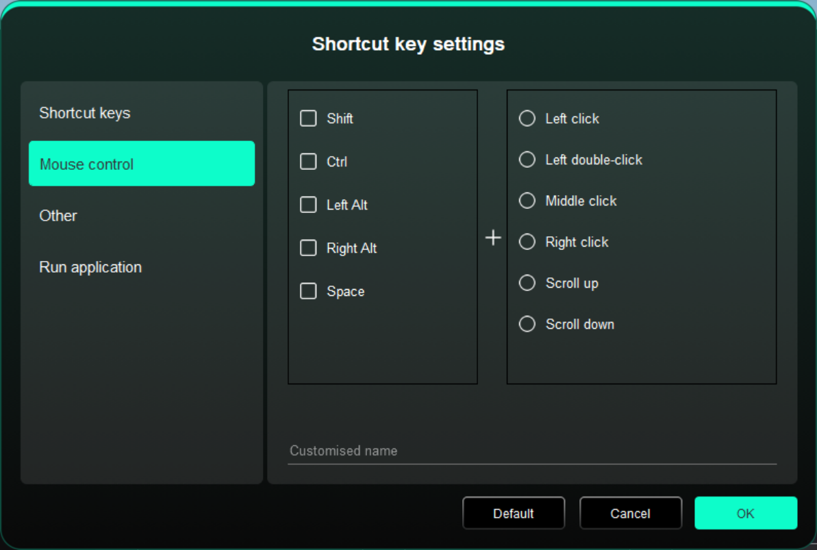 마우스와 키보드의 키 조합을 설정합니다. Shift 및 Left Click을 선택하면 이 키 조합을 지원하는 애플리케이션에서 바로 가기를 사용할 수 있습니다.