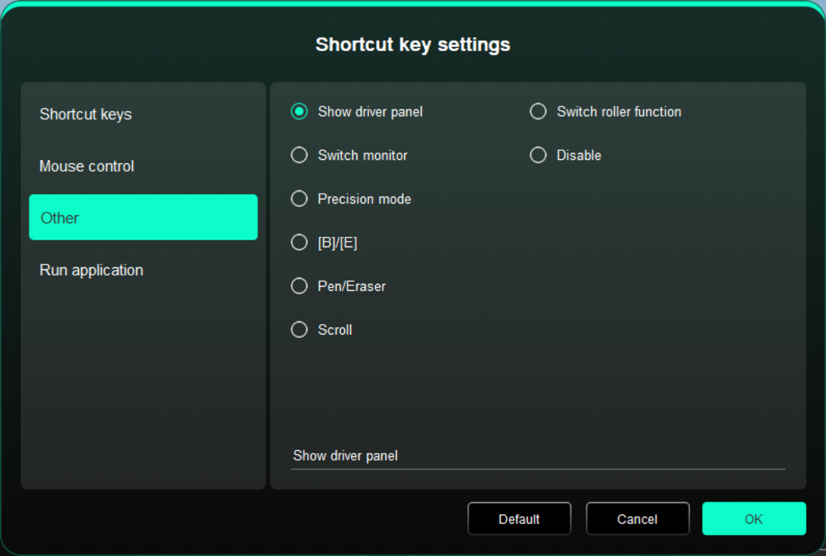 애플리케이션 중 하나를 선택하면 단축키, 스크롤 휠 및 펜 키 기능을 사용자 지정할 수 있습니다. 변경 사항은 해당 애플리케이션을 사용할 때만 유효합니다. 다른 애플리케이션으로 전환할 때 드라이버는 자동으로 인식하고 해당 설정으로 전환됩니다.