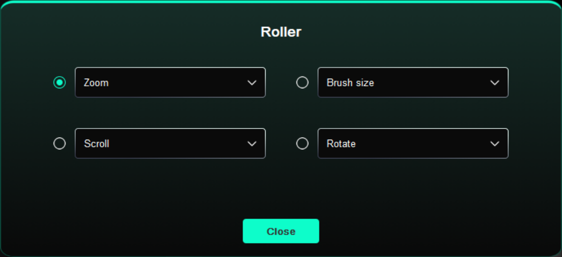 드라이버는 확대/축소(기본값), 브러시, 스크롤 및 회전 기능을 활성화합니다.