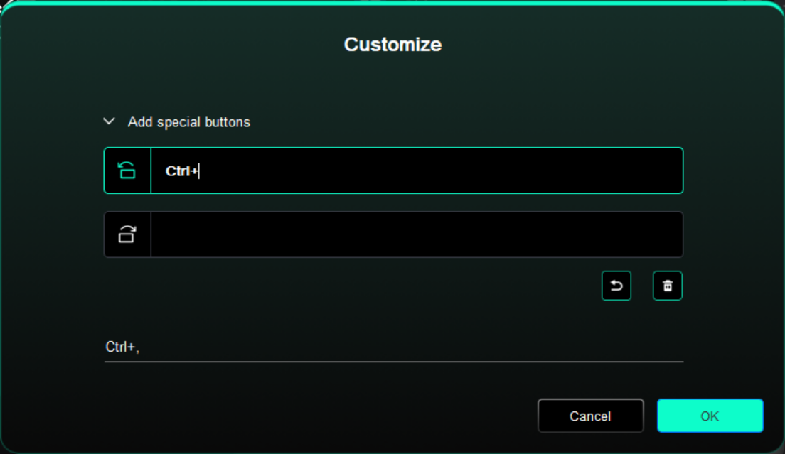 각 휠 기능 그룹의 드롭다운 메뉴에서 "사용자 지정"을 클릭한 후, 키보드로 설정할 키 또는 키 조합을 입력하여 시계 방향 및 반시계 방향 휠 기능을 사용자 지정할 수 있습니다.