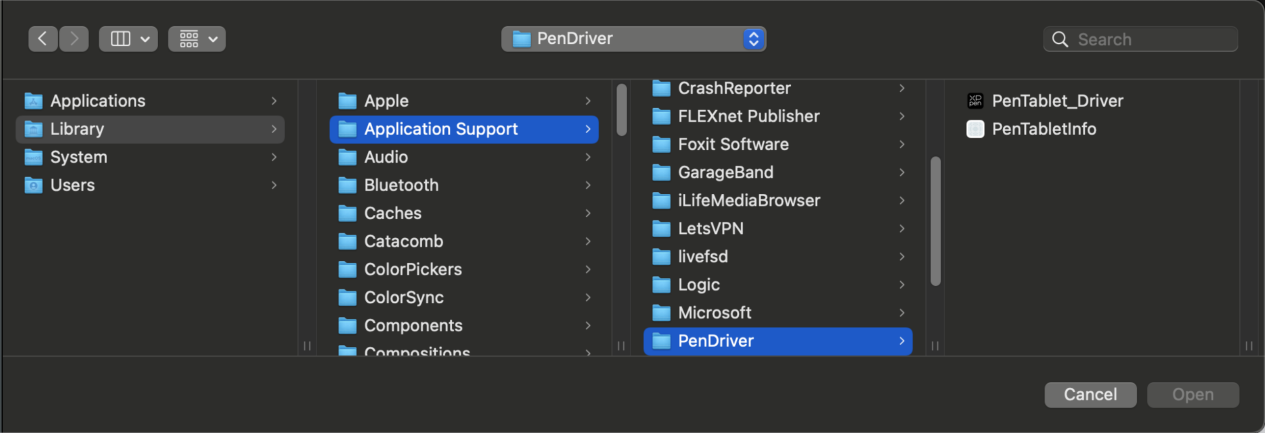 목록에 PenTablet_Driver가 없는 경우, 리소스 라이브러리 -> Application Support -> PenDriver로 이동하여 수동으로 드라이버를 추가합니다.