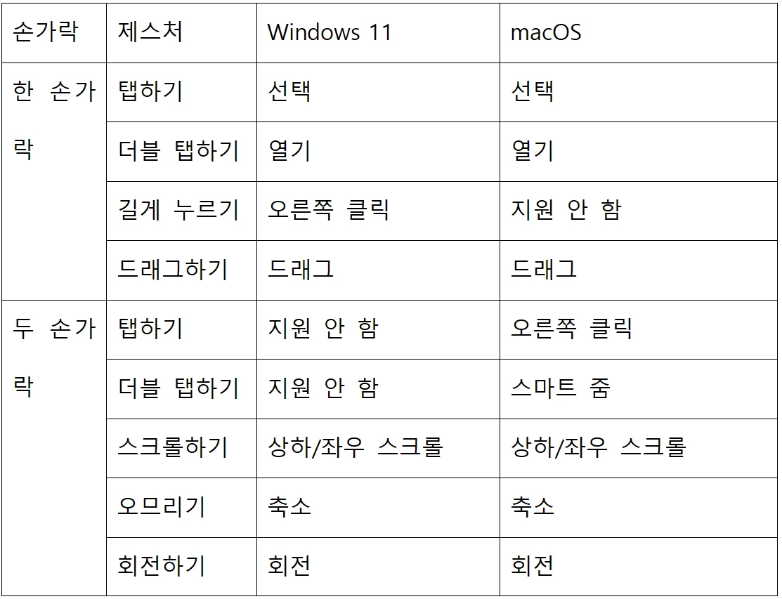 기본 제스처는 한 손가락 및 두 손가락 터치 제스처입니다. 기본 제스처를 사용하여 시스템에서 탐색, 마우스 클릭, 스크롤, 줌 또는 회전 등의 기능을 수행할 수 있습니다.