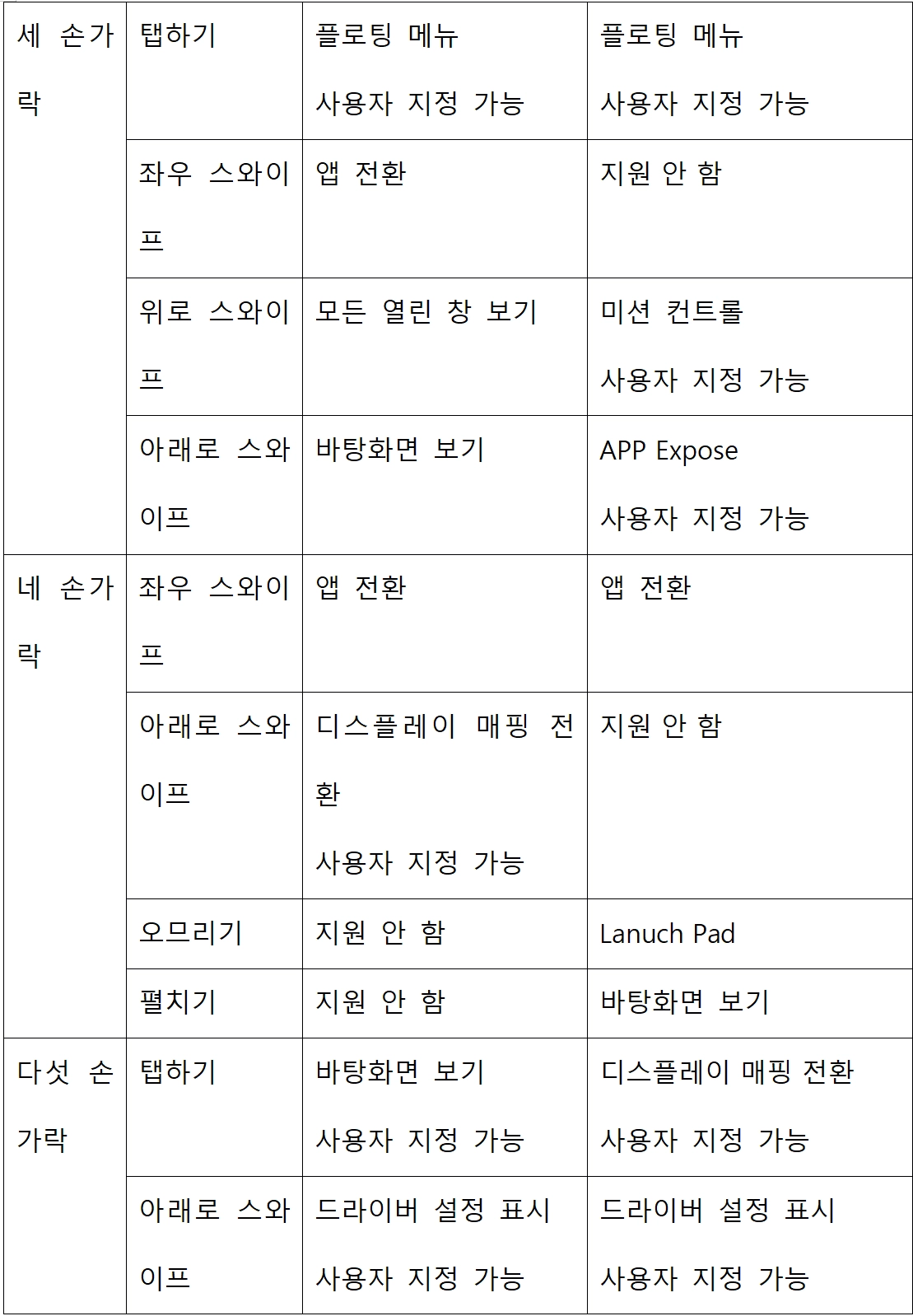주의: 운영체제 버전에 따라 일부 운영체제에서 기본 제스처가 지원되지 않을 수 있습니다.