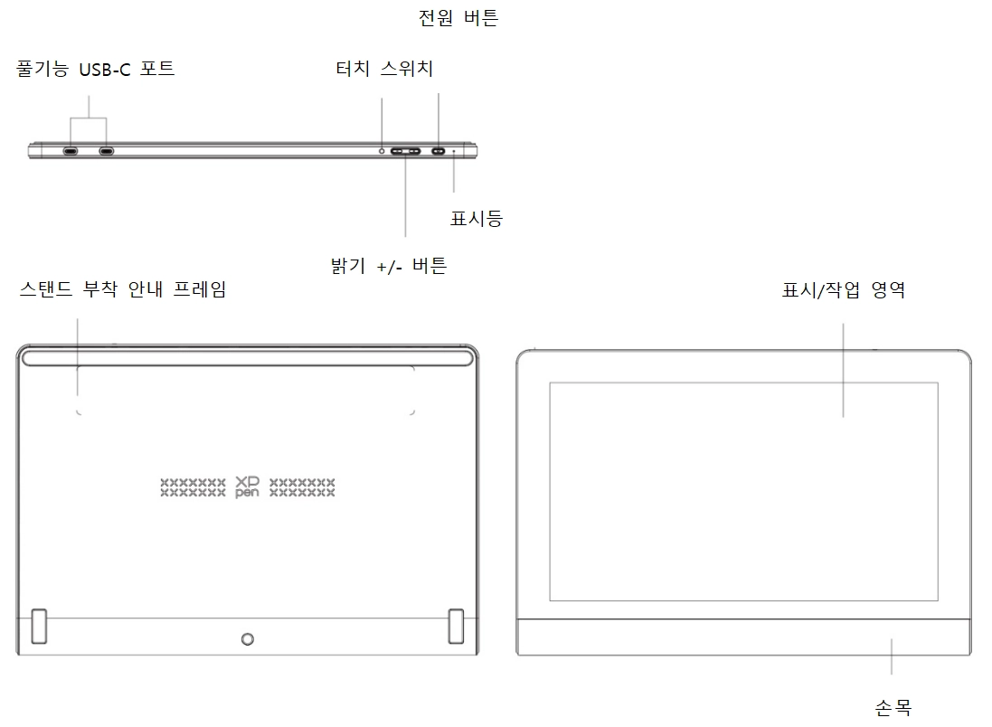 펜 타블렛 모드: 전원 버튼을 3초간 길게 누르면 표시등이 파란색과 주황색으로 번갈아 깜빡이며 펜 타블렛 모드로 진입합니다. 전원 버튼을 다시 누르면 액정 타블렛 모드로 복귀합니다.