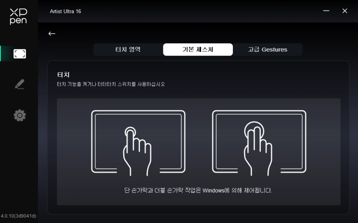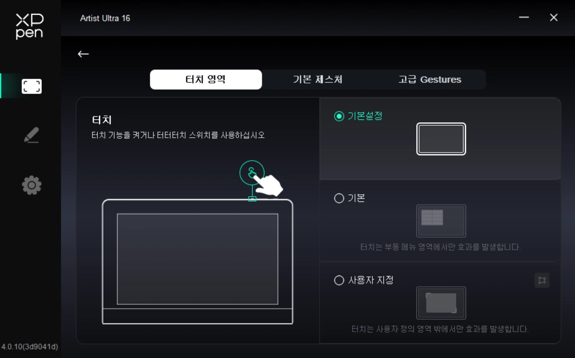 Artist Ultra 16은 멀티 터치 기능을 지원하며, 제스처를 통해 창작 효율을 높일 수 있습니다. 상단 터치 버튼을 통해 터치 기능을 켜거나 끌 수 있습니다.