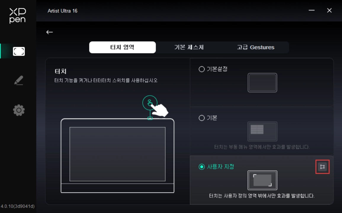 사용자 지정: 사용자 지정 영역 외부에만 터치 입력이 적용되며, 예를 들어 캔버스 영역과 같은 사용자 지정 영역 내부에서는 단일 또는 다중 손가락의 터치 입력을 감지하지 않습니다.