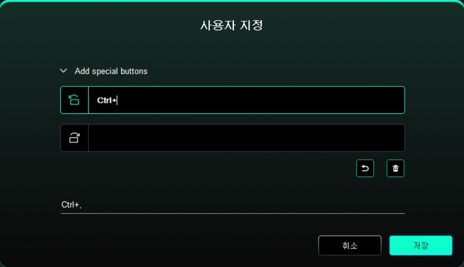 그림에서 휠 위치를 클릭한 후, 사전 설정 기능 풀다운 메뉴에서 '사용자 지정'을 선택하고, 키보드를 통해 설정하려는 단일키 또는 조합키를 입력하여 휠의 시계 방향 및 반시계 방향 기능을 사용자 정의합니다.