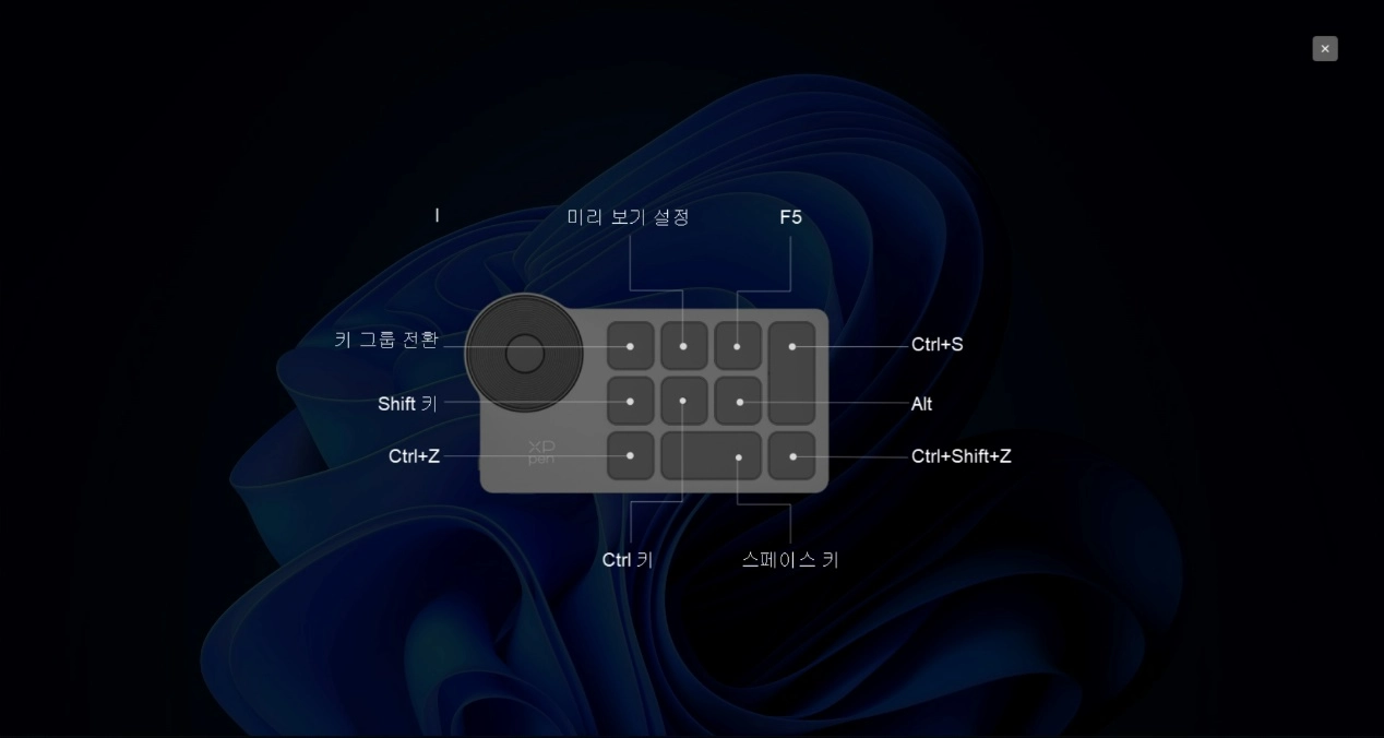 현재 사용 중인 단축키 그룹 기능을 확인하며, 드라이버에서 활성화되지 않은 단축키 그룹을 선택한 경우 기본적으로 그룹 Ⅰ의 단축키 기능을 사용합니다. 우측 상단의 닫기 아이콘을 클릭하여 미리보기 창을 닫을 수 있습니다.