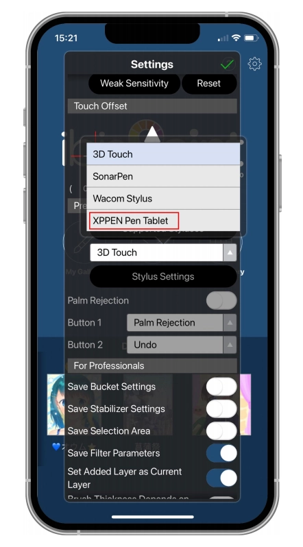 2. 설정에서 '지원되는 필기 스타일러스'를 찾아 XPPen 펜 타블렛을 선택합니다.