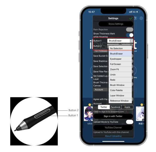스타일러스는 단축키와 펜 압력 기능이 있으며 앱에서 사용자 지정할 수 있습니다.