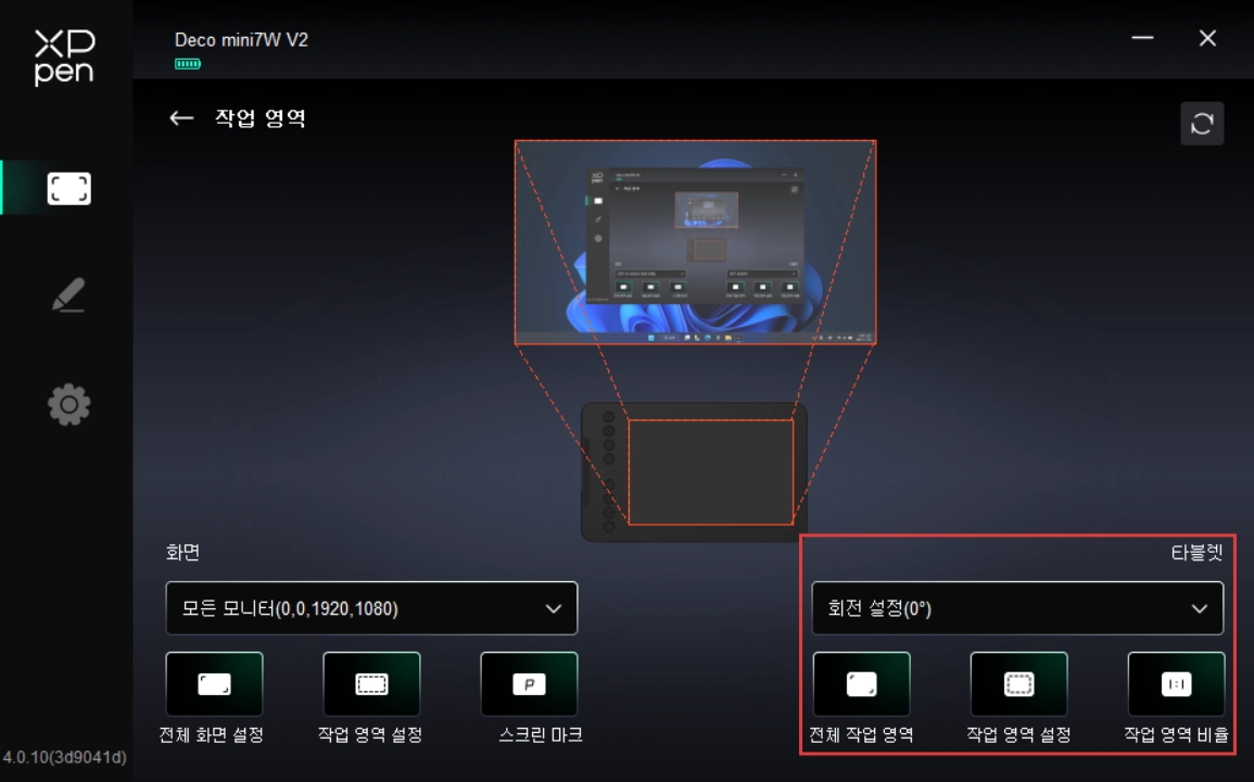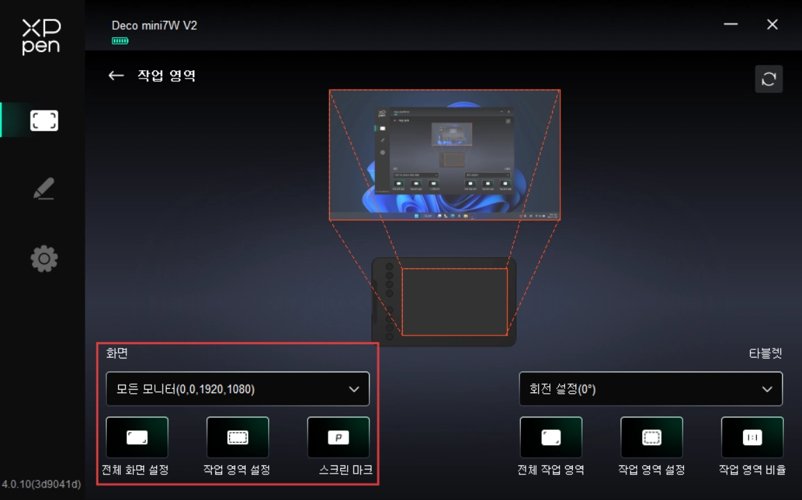 현재 펜 타블렛의 작업 영역을 설정합니다.