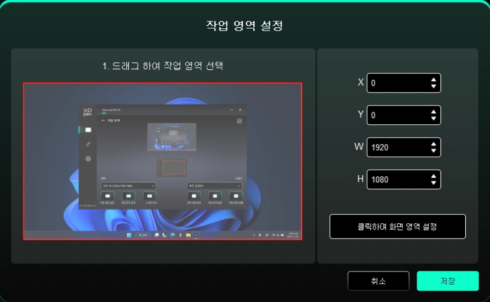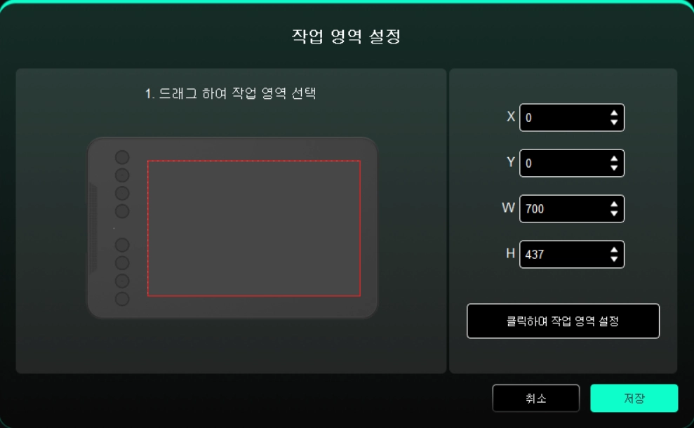 클릭으로 드로잉 영역 설정: 클릭 후 기기 작업 영역에서 펜으로 '왼쪽 상단'과 '오른쪽 하단' 위치를 차례로 클릭하여 영역을 지정합니다.