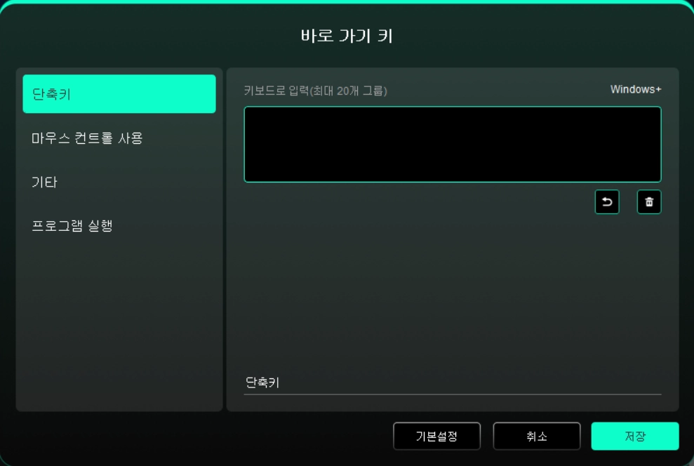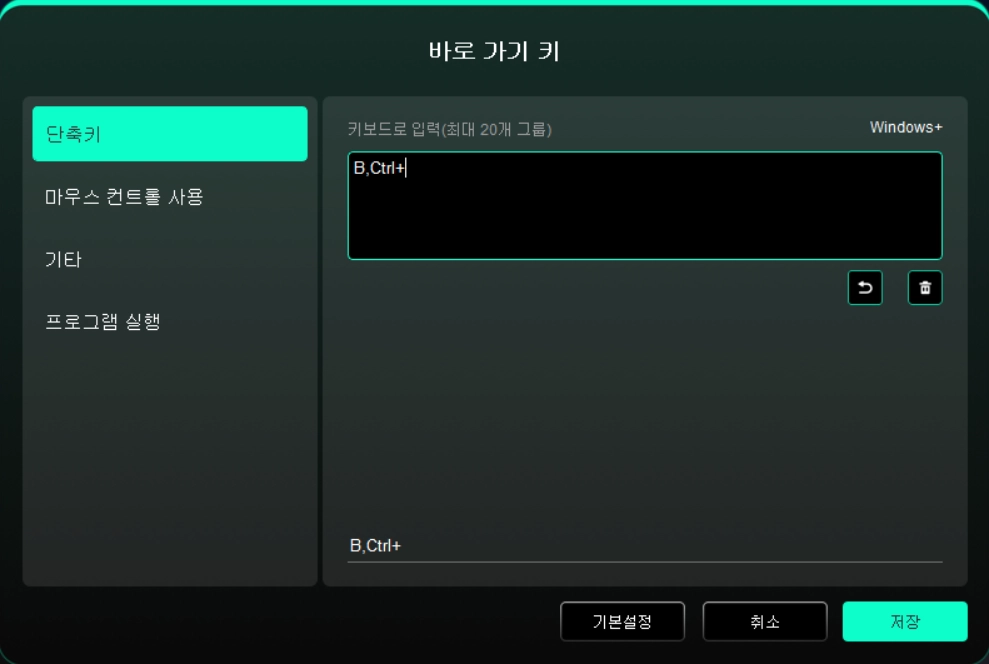 Windows(Command): 시스템 키를 포함한 조합키를 추가할 수 있습니다. 예: Win(Cmd)+Shift+3를 입력해야 할 경우, Shift+3을 누르면 드라이버가 자동으로 시스템 키와 연동해 실행합니다.