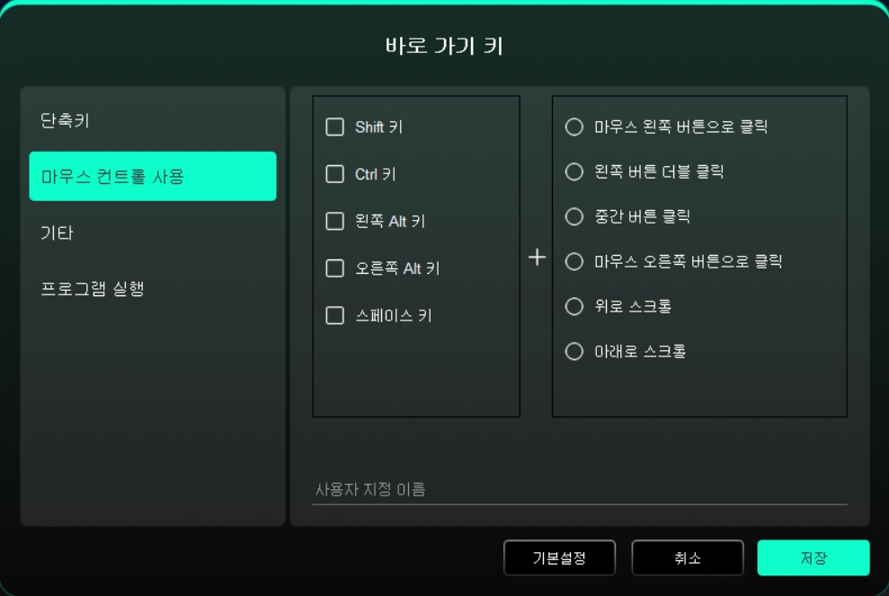 키보드+마우스' 조합키를 설정할 수 있습니다. 예: 'Shift'와 '단일 클릭'을 선택하면 해당 조합키를 지원하는 소프트웨어에서 해당 단축키 기능을 실행할 수 있습니다.