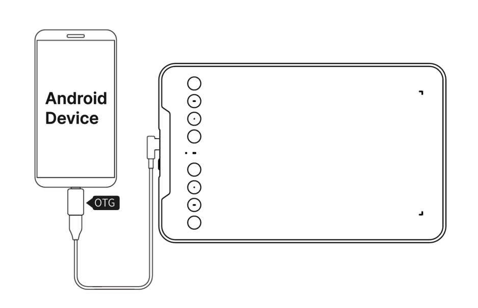USB-A to USB-C 케이블로 펜 타블렛을 OTG 어댑터에 연결한 뒤, Android 스마트폰 또는 태블릿에 연결하십시오.